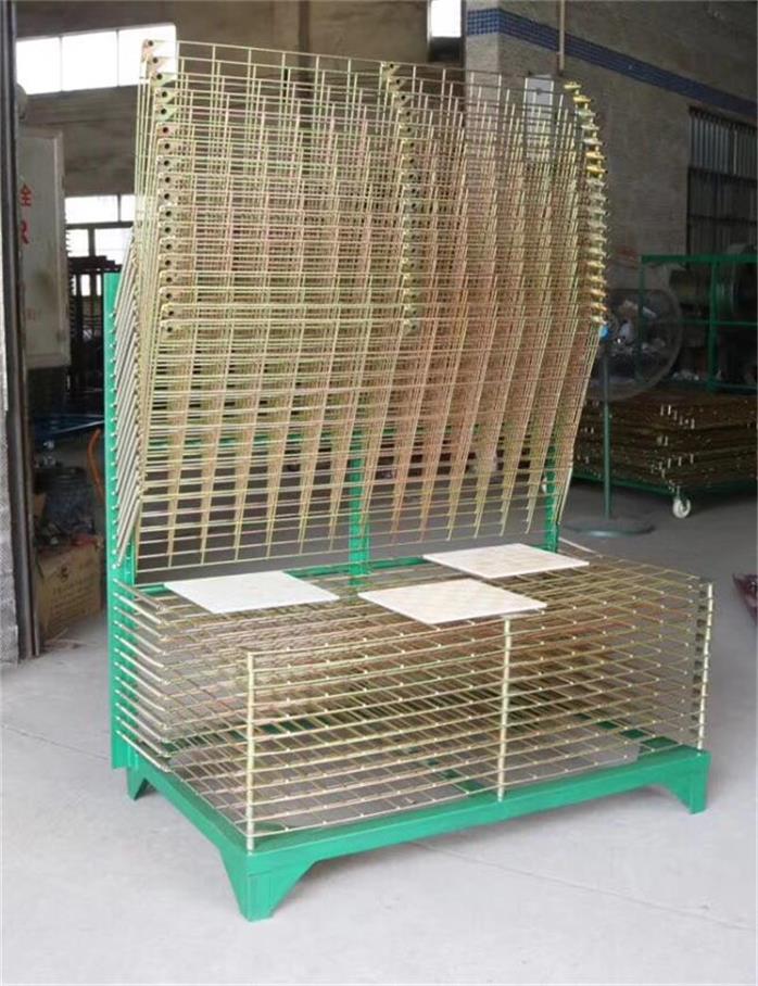 千層架,又叫絲印千層架、乾燥架、千層車、晾曬架、晾紙架、網架、層架臺車。適用于印刷、上膠上色,濺鍍後的晾乾置放器材。活動式多層網格設計,置放空間大,操作方便,節省車間、庫房面積,并可適用於所放產品的常溫晾乾和進焗爐高溫烘烤。使用的材料有不銹鋼,碳鋼等。主架一般采用角鋼制作,表面處理有噴漆/烤漆/電鍍鋅;網片采