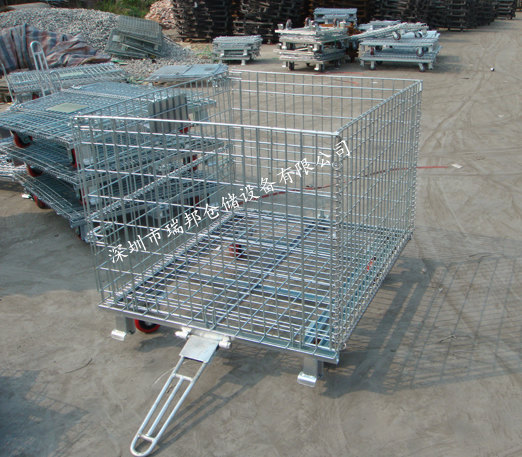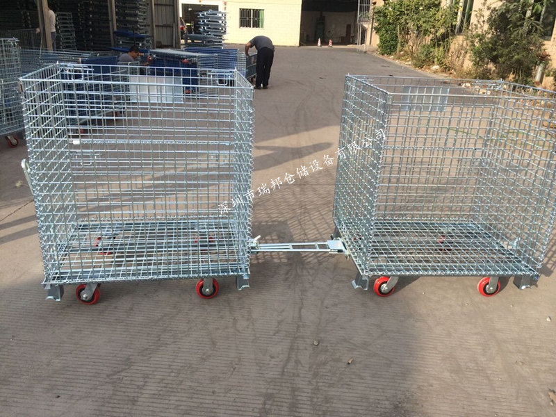 帶牽引倉儲籠通常用來存儲或轉運金屬零件。分為不可折疊式與可折疊式兩種:其中不可折疊式因經過特殊加固處理,因此承重量較大,一般可堆疊較多層;而可折疊式的設計則為隨時存取提供了方便,在堆疊存儲時,可以隨時打開小門存入或取出物品,免除翻倉的麻煩。