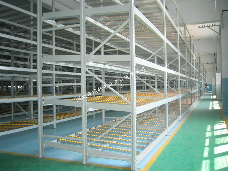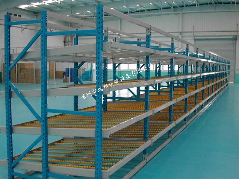 滾輪式貨架又稱流利貨架、滑移式貨架。 這種類型的貨架利用貨物自身的重量自行下滑,貨物先進先出,適于大批量同類貨物的存儲,適用于生產線或裝配線上物料的存放,貨物至于滾輪上,利用一邊通道存貨,另一邊通道取貨。滾輪式貨架 流利條貨架 自滑式貨架的料架朝出貨方向傾斜,貨物在重力的方向作用下沿滾輪向下滑動;可實現先進先出,并可實現一次補貨,多次練貨。