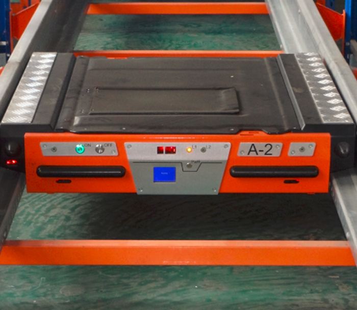 小車由無線電遙控,通過無線電遙控操作的穿梭車,可以承載托盤貨物在導軌上輕松運行;車載電池提供續航能力,主要依靠四個輪子前后行走。多個巷道可以共同用一部穿梭車。穿梭臺車的數量由巷道深度、貨物總量、出貨頻率等綜合因素來決定的。